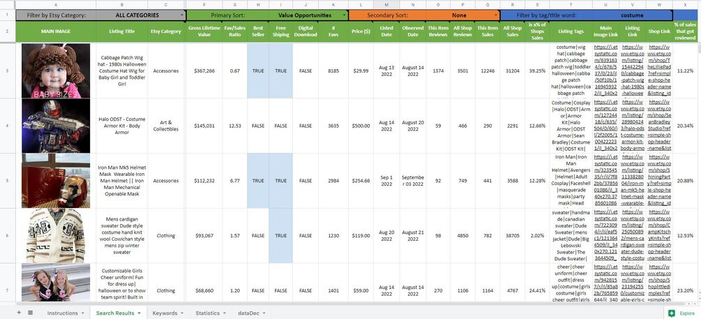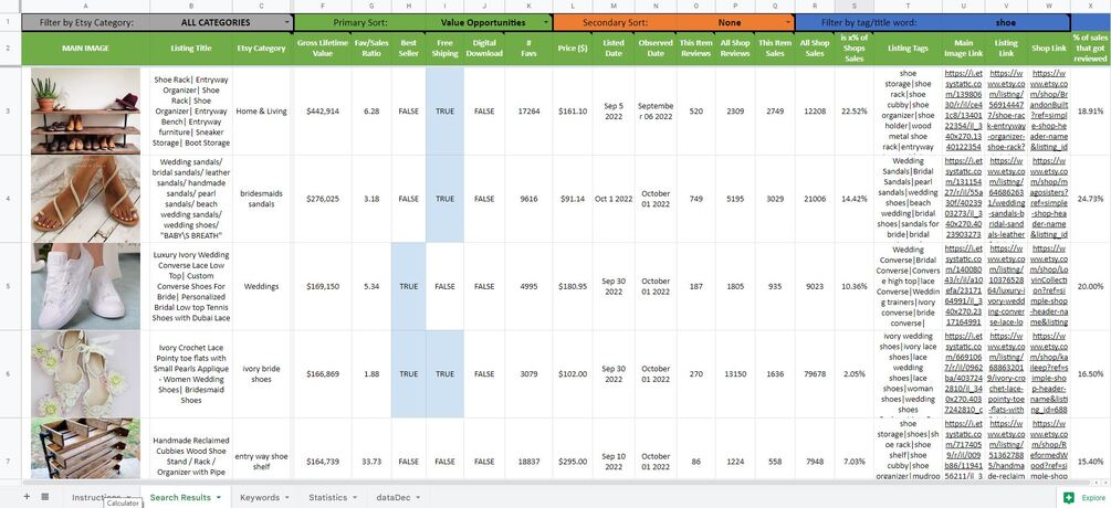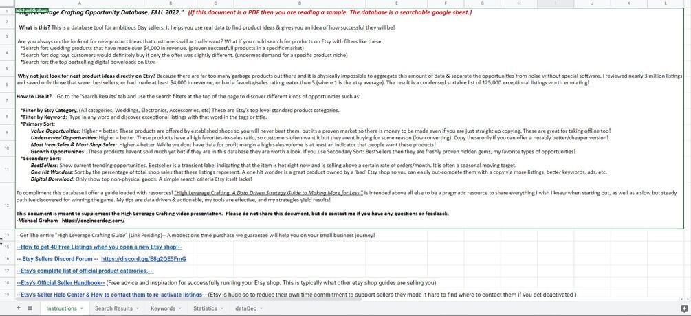 This is a free sample of the 'High Leverage Crafting Opportunity Database'. It contains a list of the Top 500 all time highest yielding (by revenue) Etsy listings. The database is normally searchable but I am selling access to it though my new course, so this free sample is limited in capability.